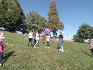 W tradycyjnym Dniu Latawca wyruszyliśmy na pobliską Łabajkę, gdzie wspaniale pobawiliśmy się naszymi latawcami. Niektóre były trochę leniwe, więc musieliśmy się nieźle nabiegać, by zmusić ich do latania 😅. W końcu wszystkie cudownie szybowały po niebie… Wypróbowaliśmy też współpracę w grupie, dzięki której znaleźliśmy skarb ukryty na drzewie.