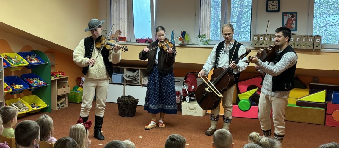 V pátek 8. listopadu přijeli navštívit naši mateřskou školu členové dvou lidových kapel – Czerchla a Bezmiana, kteří seznamovali děti nejen s lidovými písněmi našeho kraje, ale také s tradičními zvyky a nářečím. Děti se zájmem poslouchaly hudební produkci, a také se s chutí aktivně zapojily do připravených aktivit.