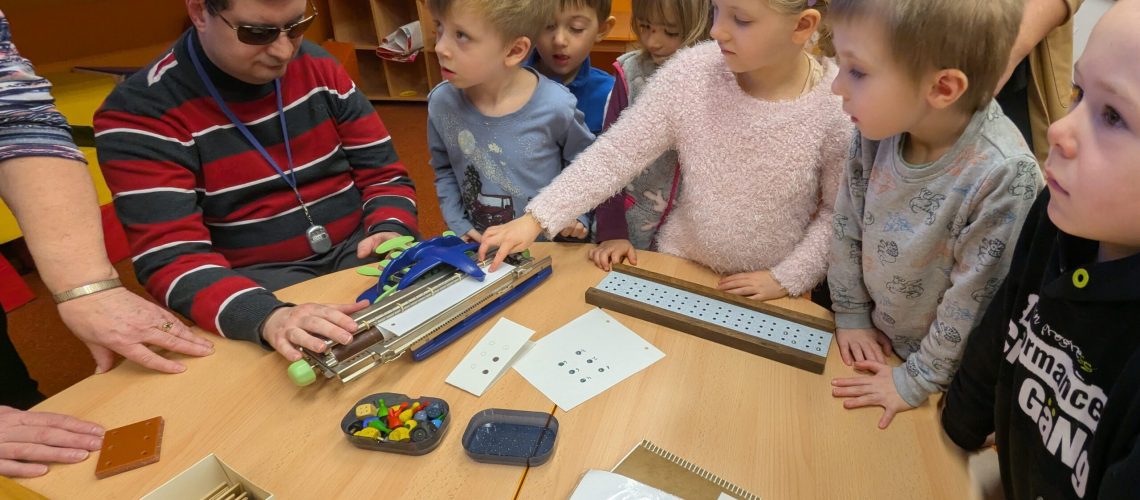 Wzrok, słuch, węch, smak, dotyk – zmysły. To o nich rozmawialiśmy z dziećmi w przedszkolu w minionym tygodniu. Przy okazji omawiania wzroku, w środę 29.1.2025 odwiedził nas niewidomy gość. Šimon Polakovič, wraz ze swoją mamą, opowiedzieli nam o tym, jak to jest być niewidomym i czego niewidome dzieci muszą się nauczyć, by móc funkcjonować w społeczeństwie. Dzieci miały możliwość zapoznać się z alfabetem Braille’a, zobaczyć jak uczy się tego alfabetu, poznać maszynę do pisania dla niewidomych, doświadczyć, jak to jest po omacku grać w dotykowe pexeso, czy grę Człowieku nie irytuj się.
