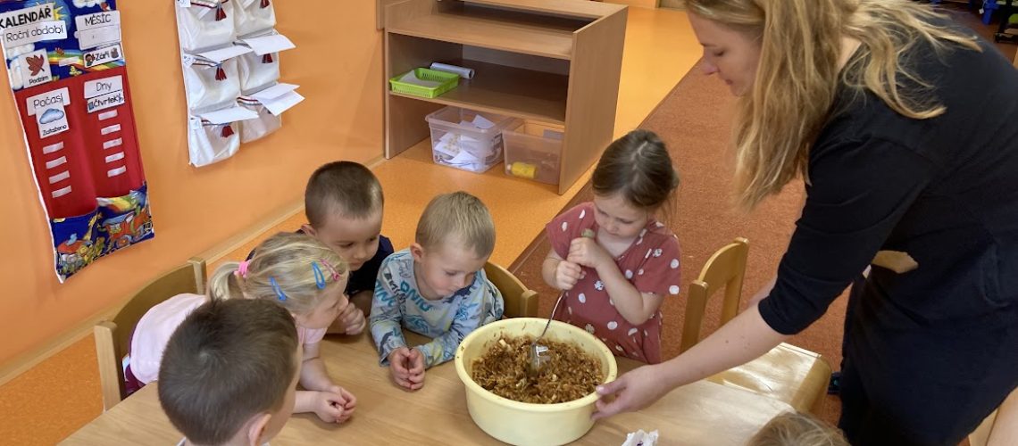 Krásné a skoro již podzimní téma „Máme rádi ovoce“ nás s dětmi motivovalo k přípravě a pečení štrúdlů. Děti se se zájmem zapojily do veškeré přípravy. Vyzkoušely si okrajování, strouhání a plnění těsta jablky, rozinkami, posypání cukrem, kde si mohly procvičit i tzv. špetkový úchop. Paní učitelky pomohly dětem s pečením a nakonec jsme se společně s dětmi o záviny rozdělili.