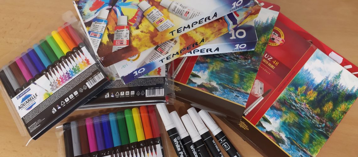 Žáci obdrželi pro využití v kroužku akvarelové a temperové barvy, fixy, štětce a další výtvarný materiál.