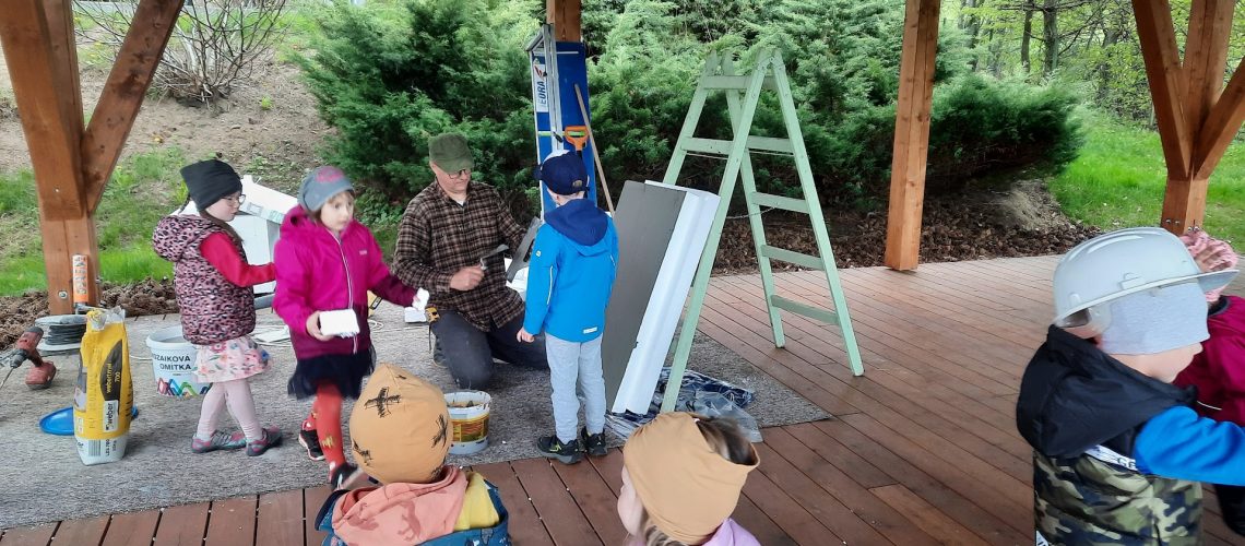 Navštívil nás pan Zalisz, který dětem předvedl, co obnáší práce stavaře. Ukázal dětem nářadí a různé druhy stavebního materiálu a poté s dětmi postavil domek.