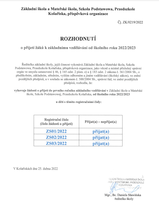 Rozhodnutí o přijetí žáků k základnímu vzdělávání