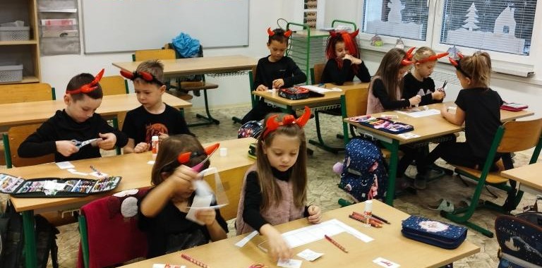 POZOR! DNES ČERTÍ ŠKOLA!Plakát s tímto nápisem se objevil na dveřích třídy prvního ročníku 5. prosince 2025. Žáci i paní učitelka se na jeden den proměnili v čertíky a čertice. Počítali pekelně těžké příklady, luštili zapeklité křížovky