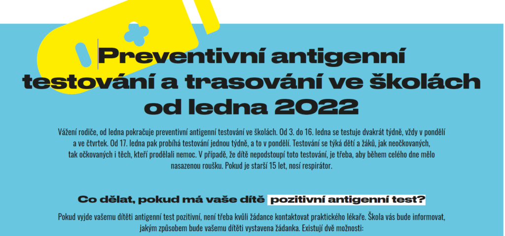 I v tomto kalendářním roce bude pokračovat pravidelné testování žáků antigenními testy, do 16. ledna dvakrát týdně, vždy v pondělí a ve čtvrtek. Vše bude probíhat nadále tak, jak jste zvyklí, žáci před příchodem do šatny podstoupí test v prostorách školní jídelny a až s negativním výsledkem testu vstupují do prostor šaten.