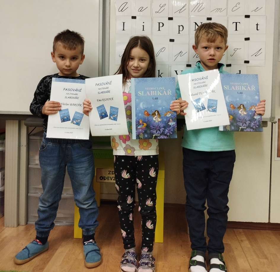 Naše prvňáčky čekalo ve čtvrtek 9. ledna překvapení. Naši nejmladší školáci byli pasováni na čtenáře Slabikáře. Při této příležitosti každý žák obdržel pamětní list a svůj první Slabikář.
